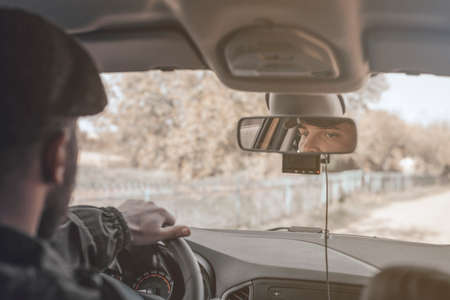 handsome bearded young man looking serious at camera sitting behind the wheel of his car, leisure and driving concept