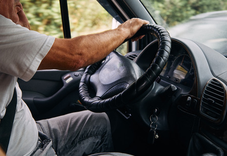 A picture of a man driving a truck wearing a hat. This image can be used to represent transportation, delivery services, or a working professional.