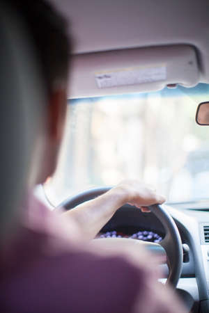 Rear side view of a young man with hands on the steering wheel while driving through an urban area
