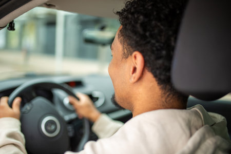 African American male drivers hands on wheel driving high speed movement sitting inside car. Man hold steering wheel over shoulder view transport transportation tourism trip cab taxi businessman work