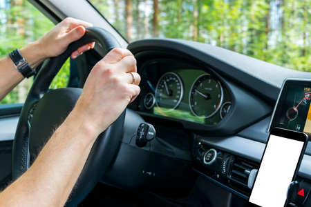 Male hands holding car steering wheel. Hands on steering wheel of a car driving near the lake. Man driving a car inside cabin. Smartphone in holder with isolated white empty blank screen. Copy space