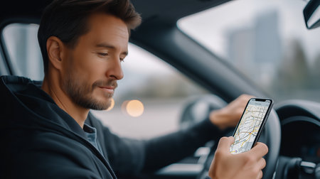 Generative AI cropped image shows a man using GPS on a smartphone while driving