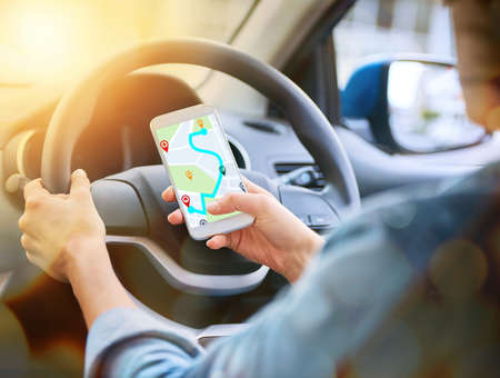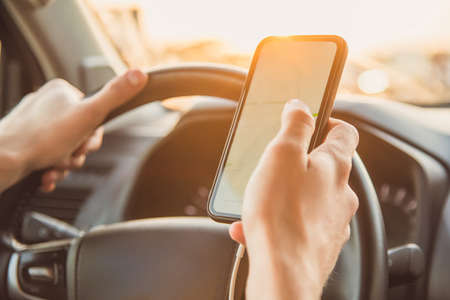 Man in plaid shirt sitting in the car and holding black mobile phone with map gps navigation, toned at sunset.