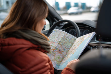 A woman is focused on a detailed road map while sitting in the drivers seat of her car. Her surroundings show a busy area with other vehicles visible.