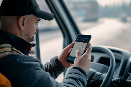 A delivery driver focuses on their smartphone GPS to find the next destination, ensuring efficient navigation through city streets. The moment captures the essence of modern logistics.