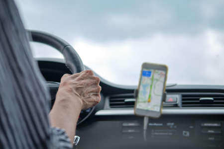 Simulated picture of the driver's hand using a smart phone, black screen inside the car, locating through a near-distance GPS navigation application, parked on the side of the road.