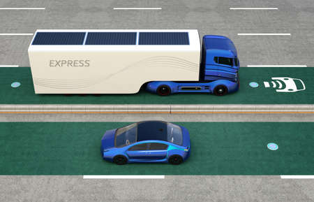 Hybrid truck and blue electric car on wireless charging lane. Electric vehicle wireless charging concept. 3D rendering image.