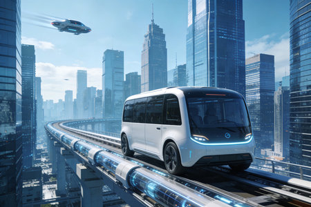 A collection of futuristic autonomous vehicles glide smoothly on an advanced rail system in an urban environment, symbolizing the future of transportation technology.