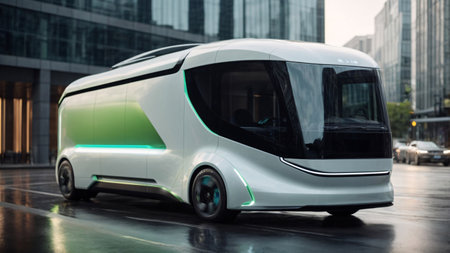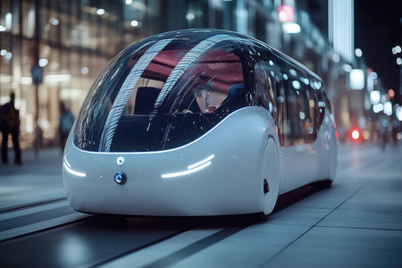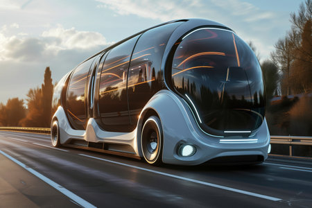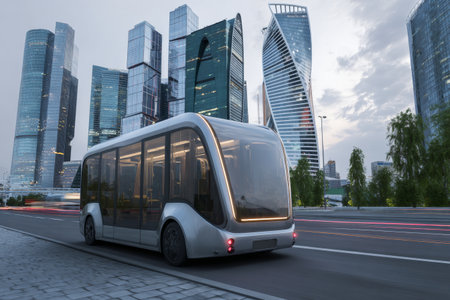 Futuristic self-driving bus is transporting passengers in a smart city, showcasing innovative transportation solutions