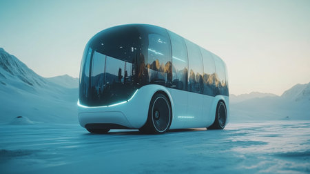 Futuristic Autonomous Electric Bus With Panoramic Windows on a Frosty Snowy Mountain Scenery