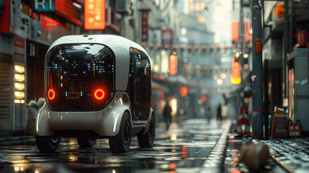Futuristic autonomous vehicle navigating a vibrant wet city street at night with neon reflections