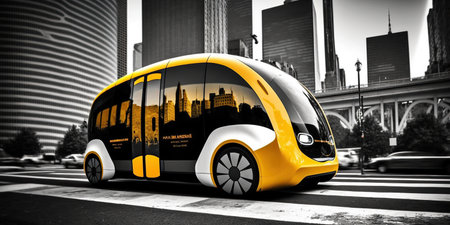 A hybrid futuristic electric shuttle bus is an autonomous smart vehicle transport option for future AI Generative