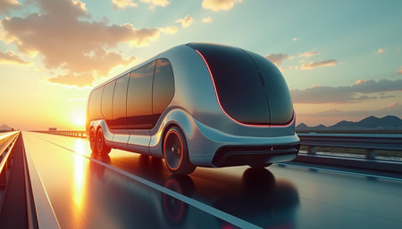 Illustration of a futuristic bus on the road in the sunset light, reflected in smooth asphalt, with elements of science fiction and an atmosphere of technological progress