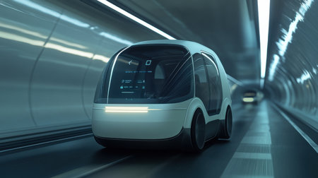 A futuristic smart car glides effortlessly through a sleek tunnel, showcasing advanced technology and modern design elements that define future transportation.