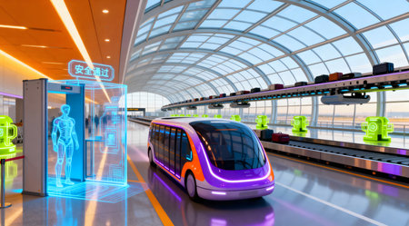 This illustration showcases a modern airport terminal with vibrant blue and green hues, featuring AI-powered security checkpoints and autonomous transport vehicles. The design incorporates natural lighting through large skylights, creating an open and airy atmosphere. Ideal for use in travel technology articles or as a futuristic backdrop in editorial content. AI-generated illustration.
