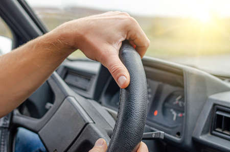 Male driver hands are holding steering wheel of truck during the movement in the road. Image with selective focus on the wheel, dashboard and blurred windshield