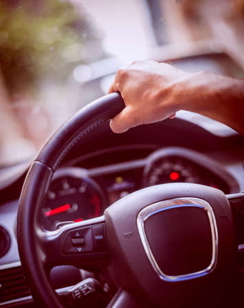 view of the hand of the people, the driver, holding the wheel of the car, closeup