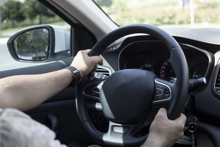 Hands of the driver of the vehicle at the wheel of the car. Driving an auto car.
