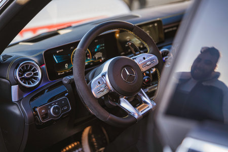 Imola, italy 01 january 2026: mercedes-benz amg interior with suede steering wheel, digital dashboard and driver reflection on window, luxury cockpit detail