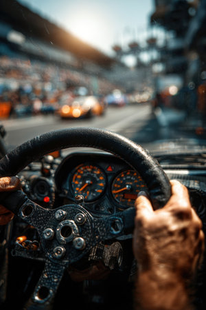 Performance Vehicle Caucasian Driver. Hands on the Steering Wheel. Automotive Theme.