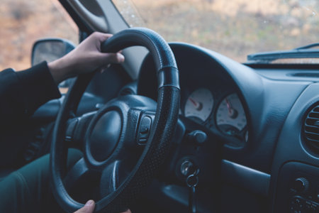 car steering wheel with driver hands on it, close-up of woman hands holding steering wheel