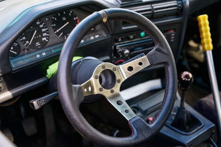 Steering wheel rotation with blur at a slow shutter speed in the passenger compartment during a drift race. Auto school and driving training.