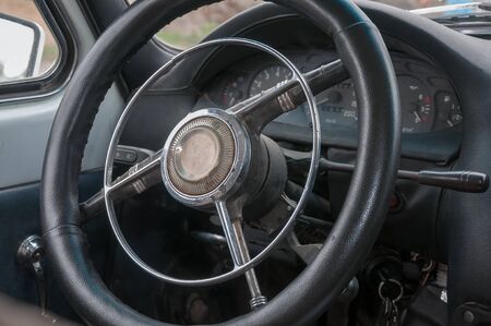 View of dashboard, steering wheel, indicators and timing gauges of a vintage American car with all the details of the interior visible.