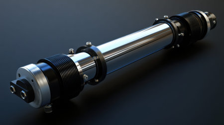 Captivating close-up of a sleek industrial metal component showcasing its intricate details and smooth surface against a black background, ideal for technology and engineering projects.