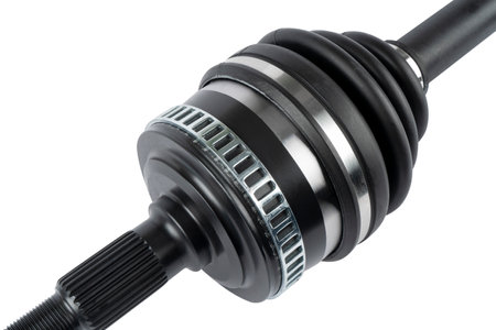 Front-wheel drive vehicle assembly isolated on white background. New car drive shaft isolated over white. Quality spare parts for car service or maintenance