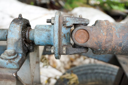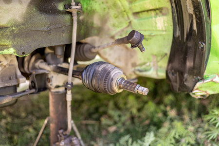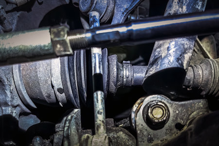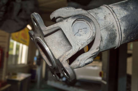 Close-up of the rusty splines and the steering shaft gimbal under the hood of the car. Car repair and maintenance