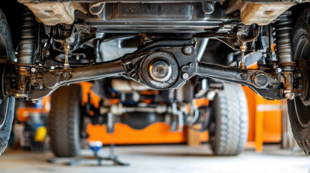 A close-up perspective of a vehicle's underbody showcasing the intricate suspension system and axle components in a garage, emphasizing functionality and design in automotive maintenance.