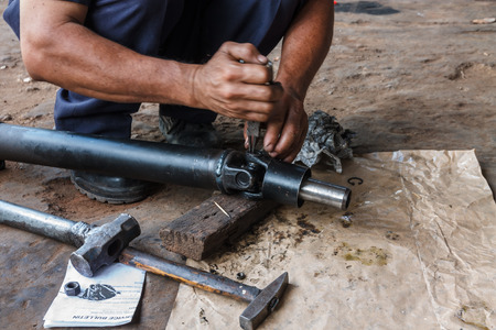 Car mechanic repairing a damaged shaft.