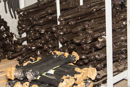 Used car parts on the factory shelf. Used auto parts for sale in a store in a landfill. Shrews, semi-axle drive of cars. Disassembly of cars.