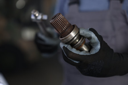 Greasy CV joint held by mechanic in black gloves after disassembly