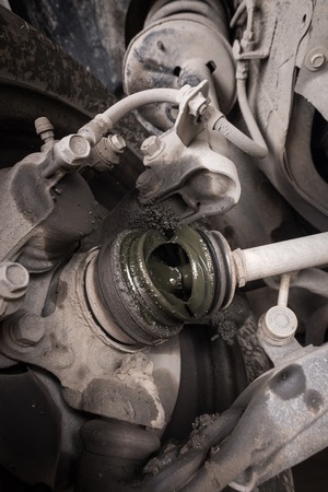 Broken CV joint on the car. The casing burst, lubricant flows. Close up of Damaged broken CV axle boots on a front wheel drive car.