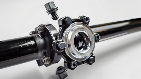 A close-up of a metal pipe fitting, highlighting strong bolts and a smooth surface in a well-lit workshop environment.