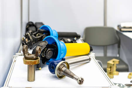 The spare part of the car is a metal steering propeller shaft with hinges on a white background with inscriptions designating the model. Repair of equipment at the auto-parsing in the workshop.