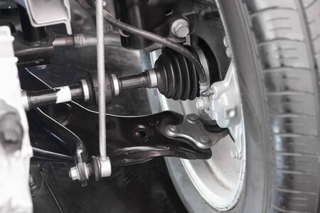Car suspensions. Close up of a car suspension parts system such as CV joint Rubber boot and Control arms bushing Steering rack axles Shock absorber suspension Brake. Repair and spare parts for cars.