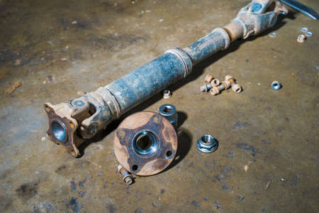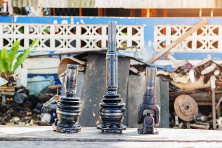 Old used dirty CV joints close-up among used automotive scrap metal CV joints replacement, car repair