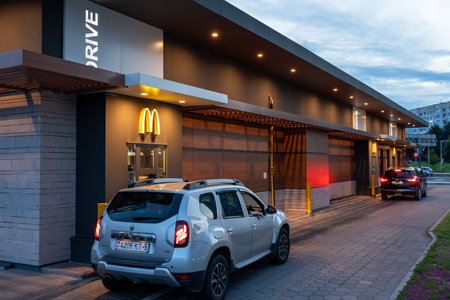 Cars at McDonald's drive thru service. Minsk, Belarus, 2022