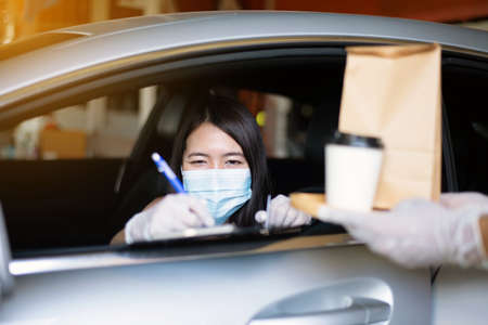 Woman sign for delivery food in car,Safety food during coronavirus pandemic situation,Drive thru service