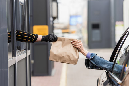 Selective focus to hand of staff wearing medical glove and mask to handed a food to customer. Drive thru and take away concept.