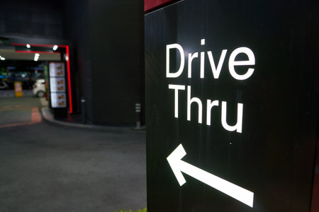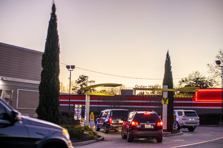 drive-thru with queue of customers waiting to be served, created with generative ai