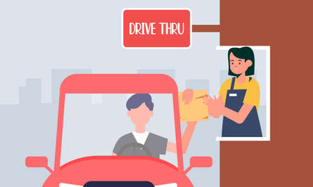 Drive Thru vector concept: man buying packaged food at the restaurant through the drive thru bar