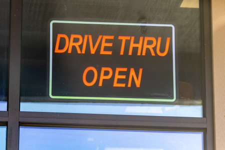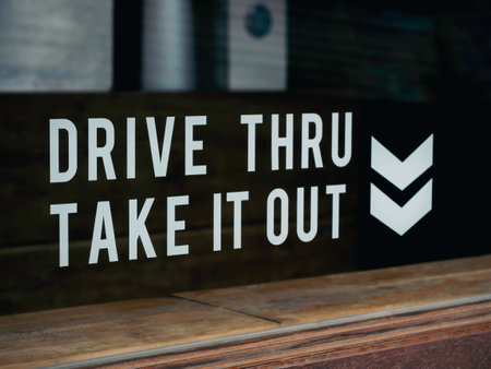 Drive thru, take it out, white information sticker message placed on cafe glass window with arrow sign. Drive through and takeaway for buy drinkings.