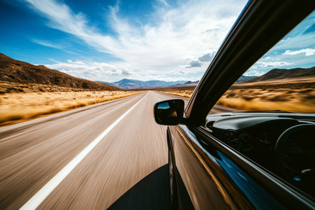 A long, straight road stretches into the horizon through a barren desert landscape, flanked by dry shrubbery, under a vast open sky with scattered clouds and distant mountain ranges visible. AI generated image