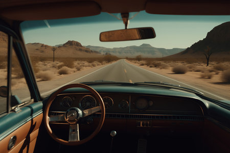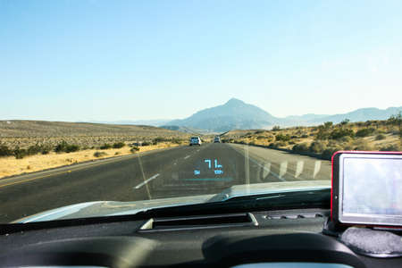 Beautiful wallpaper background of a highway view with a mountain on the background from inside the car. Driver perspective with a gps and information reflected on the front shield.
