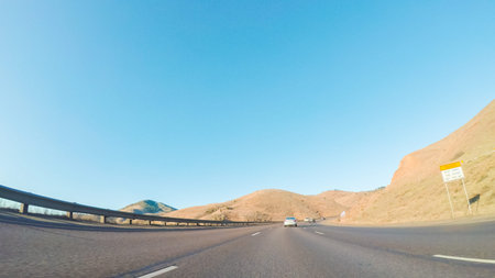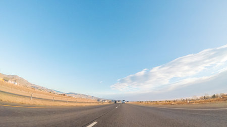 Driving on Interstate highway I70 in the mountains at sunrise.