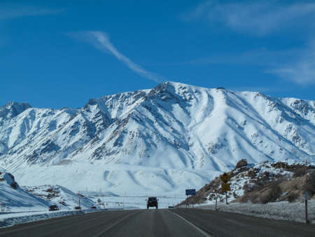 Road to Snow capped Sierra Nevada Mountains blue sky with clouds