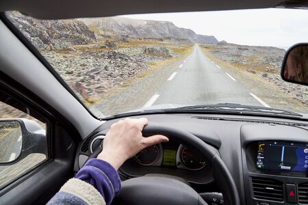 View from car window on the road and pity strange landscape with a mountains, rocks and cloudy sky and hand of woman. Landscape through windscreen in Norway. Single trip for isolation in a coronavirus